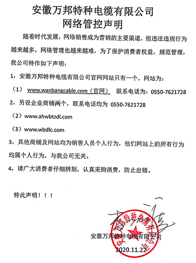 鄭重聲明:安徽萬邦特種電纜有限公司官方網站為:www_wanbangcable_com.bj8387.com,除此之外無任何子網站或合作網站,其余均為假冒偽劣。電話:0550-7621728 13485756353 地 址:安徽省天長市滁州高新技術產業開發區經四路29號